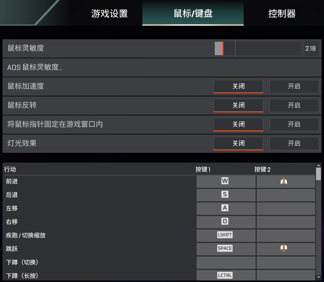 鼠标加速度:同样滑动距离,鼠标移动速度越快,距离移动越远。不适合对鼠标移动距离的精准控制,推荐关闭按键里面:如何需要身法,前进设置为上滚轮,跳跃下滚轮