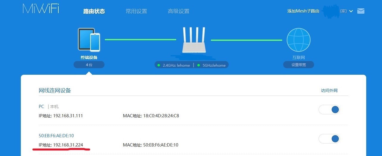 - 光猫LAN口连接小米路由器WAN口并登录小米路由器管理页面