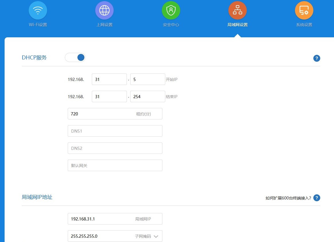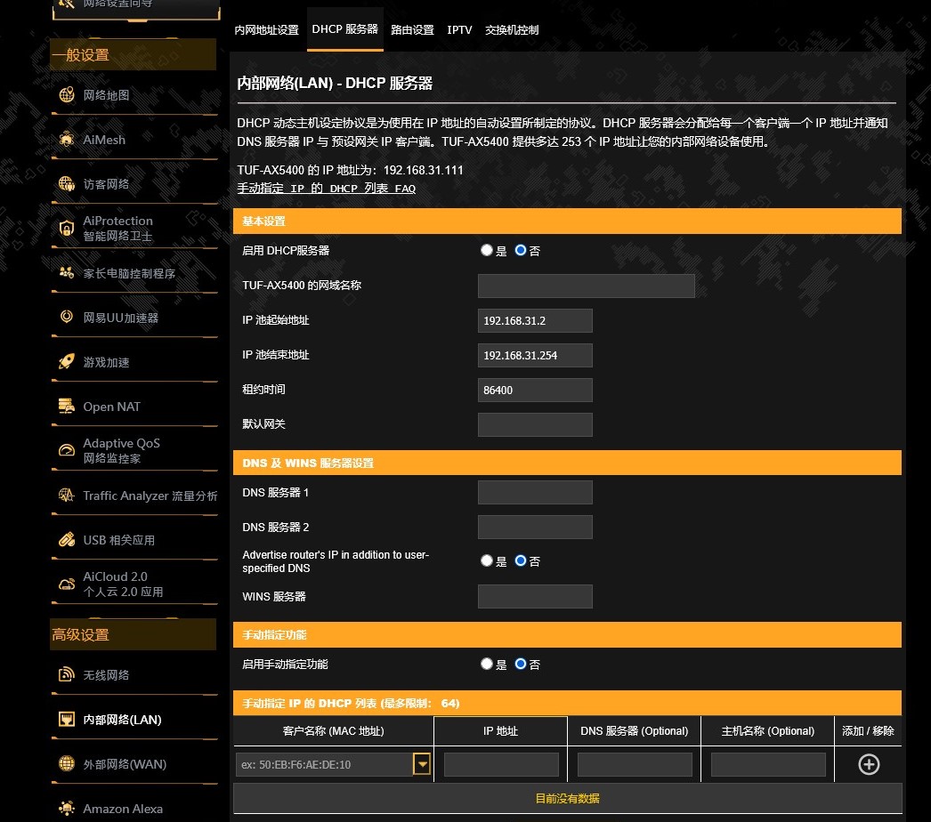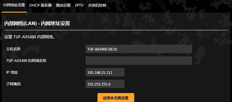 - 进入华硕路由器设置页面 -> 内部网络(LAN),将IP地址设置成小米路由器DHCP字段中的任意IP(比如192.168.31.111)