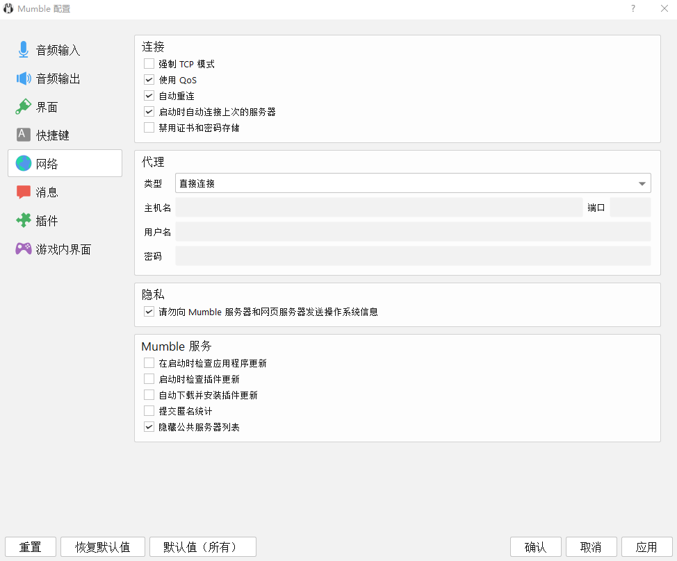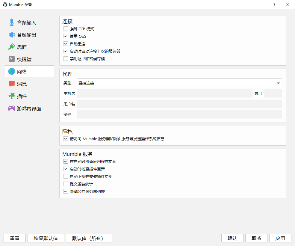 设置:在Windows注册表的HKEY_CURRENT_USER\Software\Mumble\Mumble