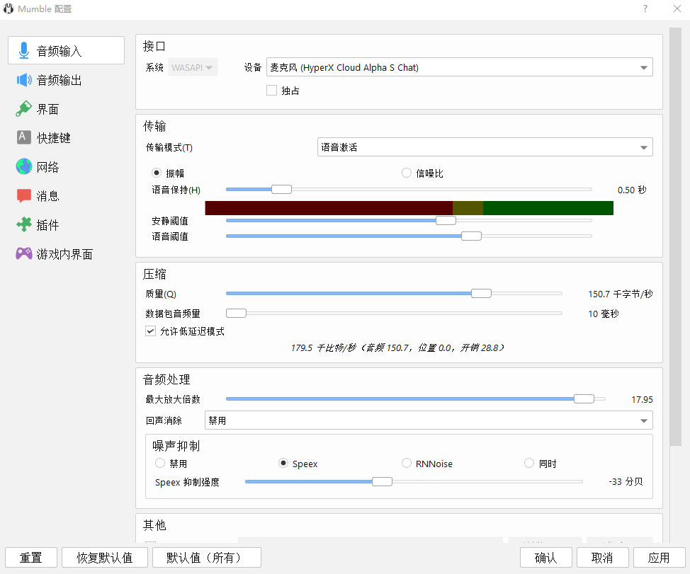 语音激活:安静阈值:低于此值视为不启用麦克风,语音阈值:高于此值使用启用麦克风