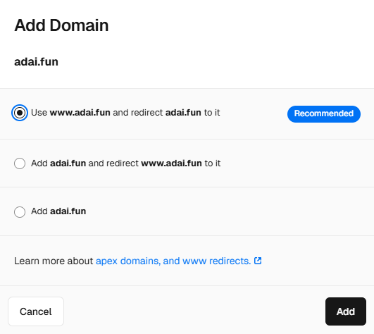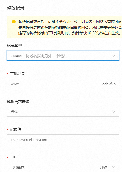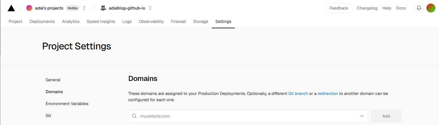 但Velcel域名被墙了,需要绑定一个新的域名,选择仓->Settings->Domains->添加域名