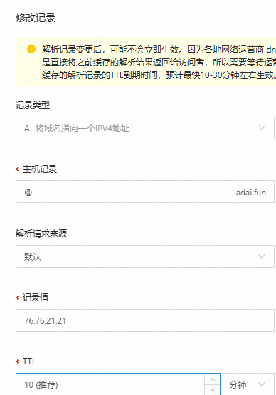 打开域名管理:域名列表->选择购买域名->域名解析。创建如下规则